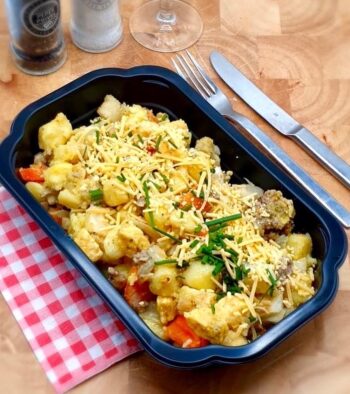 – Schep de maaltijd over in een hittebestendige ovenschaal. Zet de oven op 160 gr. Celcius en maa het gerecht in ca. 15 minuten warm.