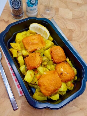 Gebakken vis in beslag met kruiden. Geserveerd met gebakken aardappel, remoulade saus en coleslaw. De vis kan het beste in de oven worden verwarmd. Magnetron kan ook, maar dan minder knapperig.