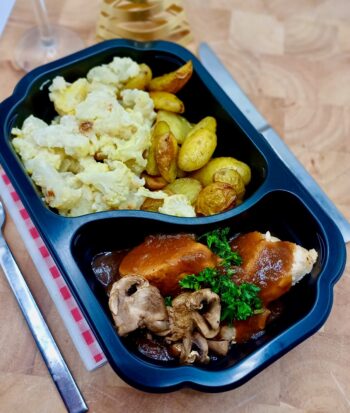 – Zet de maaltijd in een stoomoven op 100% stoom bij 100 gr. Celcius. Laat het folie zitten, ook niet inprikken. In ca. 20 minuten is het gerecht warm.