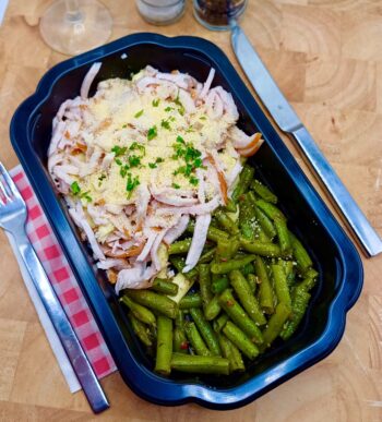 – Schep de maaltijd over in een hittebestendige ovenschaal. Zet de oven op 160 gr. Celcius en maa het gerecht in ca. 15 minuten warm.