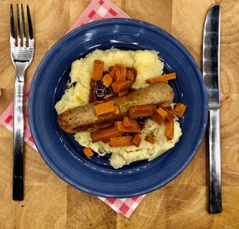 Zuurkool, polder aardappel, creme fraiche, melk (LACTOSE), MOSTERD, ananas, vegetarische worst van soja eiwit, jus van runderbouillon (water, runderbotten, ui, wortel, SELDERIJ, ketjap (SOJA)), peper, zout, maizena.